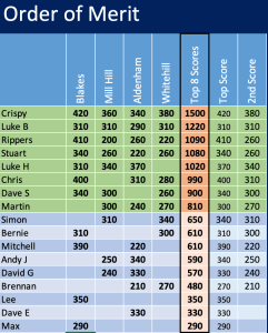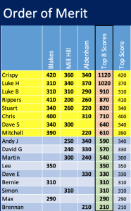 If there is no outright winner of the Order of Merit at the end of the season (i.e. if the total scores are equal between two or more players), in a similar process to above, the highest individual score will determine the outright winner, the next highest individual score shall determine second place etc.